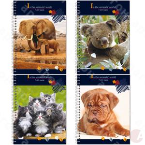 Блокнот "В мире животных" на 48 листов. Пластиковая обложка с полноцевтной печатью. Листы - белая офсетная бумага (клетка). Крепление блока - боковая спираль. Формат - А6. Дизайн обложки - ассорти (8 вариантов).