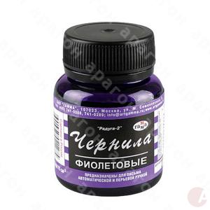 Чернила "Радуга" фиолетовые. Предназначены для перьевых ручек. Однородны по составу, на водной основе. Не просачиваются на обратную сторону бумаги. Время высыхания следа — не более 30 cек. Светостойкие. Пластиковый флакон 70 мл.