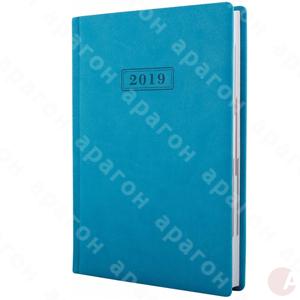 Ежедневник «Vivella 2019» датированный бирюзовый на 352 страниц. Обложка из искусственной кожи с матовой бархатистой поверхностью. Одна страница – один рабочий день. Суббота и воскресенье на одной странице. Украинский язык, дополнительно русский и английский. Угол отрывной, перфорация по кругу. Шелковое ляссе. На полях страниц – регистры. Информационный блок на 9 страниц. На форзацах – карта Украины и карта Европы. Бумажный блок белого цвета. Плотность бумаги – 65 г/м2. Формат – А5.