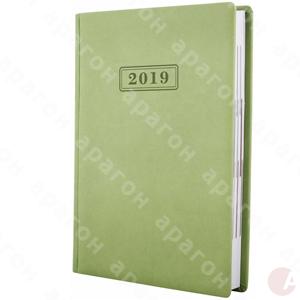 Ежедневник «Vivella 2019» датированный фисташковый на 352 страниц. Обложка из искусственной кожи с матовой бархатистой поверхностью. Одна страница – один рабочий день. Суббота и воскресенье на одной странице. Украинский язык, дополнительно русский и английский. Угол отрывной, перфорация по кругу. Шелковое ляссе. На полях страниц – регистры. Информационный блок на 9 страниц. На форзацах – карта Украины и карта Европы. Бумажный блок белого цвета. Плотность бумаги – 65 г/м2. Формат – А5.