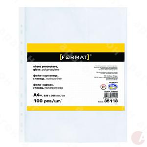Файл полипропиленовый 40 мкм. Формат – А4+. Фактура – глянец. В упаковке 100 шт.
