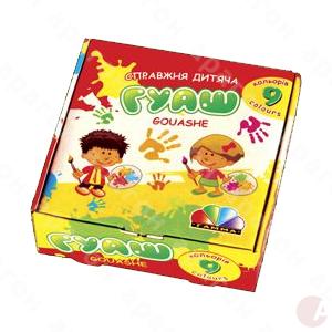 Гуашь оформительская для детского творчества. В картонной коробке в пластиковых баночках 9 цветов по 10 мл.