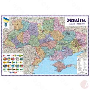 Политико-административная карта Украины. Настенная. Материал – картон, планки. ламинация. Язык – украинский. Масштаб – 1:1 000 000. Размер – 150х105 см.