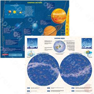 Карта звездного неба и Солнечной системы двухсторонняя. Материал – картон, ламинация. Язык – украинский. Размер – 65х45 см.
