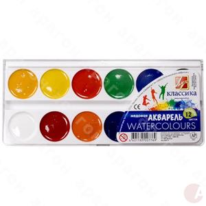 Краски акварельные «Классика» медовые полусухие. Изготовлены на основе органических пигментов и натурального связующего с добавлением пчелиного мёда, находятся в пластмассовой упаковке с прозрачной крышкой. Акварель предназначена для детского творчества и различных живописных работ. Отличается следующими свойствами: прозрачность красок, яркость и чистота цвета, отличная разносимость и размываемость. В пластиковой коробке 12 цветов.