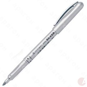 Маркер серебристый для декоративного письма и рисования на различных поверхностях. Светостойкие чернила на водной основе. След чернил наиболее стойкий на бумаге и других пористых поверхностях. Хранить в горизонтальном положении. Круглый пишущий узел. Ширина следа 1,5-3 мм.