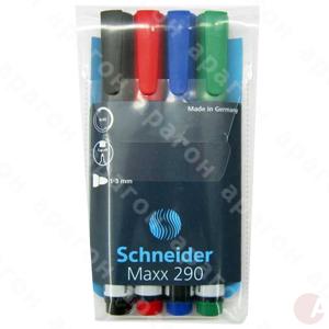 Набор из 4-х маркеров «MAXX 290» (цвета чернил – черный, красный, зеленый, синий). Для белых досок и флипчартов. Уникальная система Cap-Of-Ink сохраняет все пишущие свойства маркеров без колпачка до двух недель. Чернила практически без запаха, быстро сохнут. Надпись легко стирается, не оствляет следов.