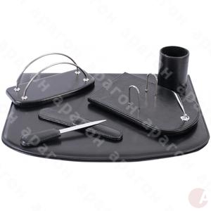 Набор настольный для руководителя на 5 предметов: подкладка для письма, подставка для почты, подставка для календаря и ручки, подставка для карандашей, канцелярский нож. Цвет – черный. Материал – искусственная кожа.