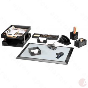 Набор настольный для кабинета 9-ти предметный: подложка для письма 58х43 см, подставка для заметок, подставка для визиток, держатель для корреспонденции, подставка для заметок и скрепок, подставка для карандашей, двойной лоток. Материал - дерево. Цвет - черный.