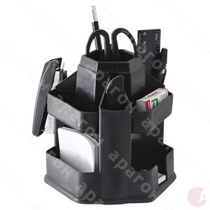 Настольный набор 10-предметный: ручка шариковая, ножницы, ластик, скрепки, карандаш чернографитный НВ, канелярский нож 9 мм, скобы №10, степлер, бумага для заметок, линейка 15 см. Вращается на 360 градусов. Изготовлен из пластика.