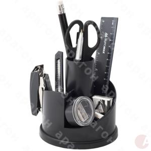 Набор настольный, с наполнением пластиковый, черный. Набор с вращающейся пластиковой подставкой 360⁰ на 16 предметов: 2 ручки, 2 карандаша, ножницы, степлер, скобы, нож канцелярский, линейка, точилка, ластик, скрепки, кнопки-гвоздики.