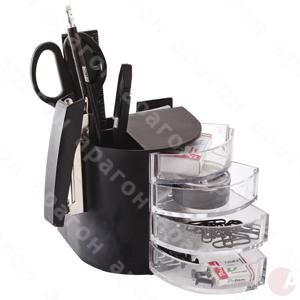Набор настольный пластиковый вращающийся 11-ти предметный: ручка шариковая, ножницы, ластик, скрепки, карандаш чернографитный НВ, точилка, скобы №10, степлер, бумага для заметок, кнопки, линейка 15 см. Цвет - черный.