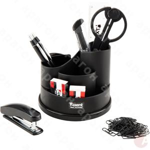 Набор настольный Axent Welle 2102-01-А в своем комплекте имеет: ножницы, линейка, степлер, нож канцелярский, скобы, ластик, скрепки, ручка, механический карандаш. 9 предметов. Картонная упаковка.