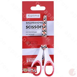 Ножницы "Вишиваночка" с пластиковыми рукоятками и резиновыми вставками. Лезвия стальные, с рисунком. Крепления лезвий – стальной винт. Длина – 13 см. В картонной упаковке с подвесом.