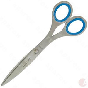 Ножницы цельнометаллические 17 см. . Лезвия изготовлены из стали, полированные под сатин. Металлические ручки с резиновыми вставками, очень удобны в работе. Крепление лезвий - заклепка.