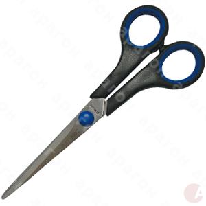 Ножницы с пластиковыми рукоятками и эргономичными резиновыми вставками. Лезвия усиленные стальные, полированы под сатин.Крепление лезвий – заклепка. Длина – 17 см.