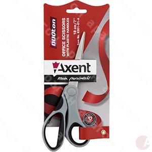 Ножницы Axent Duoton 6301-01-A имеют пластиковые ручки. Лезвия – из высокоуглеродистой стали. Асимметричные кольца эргономичной формы с резиновыми вставками предотвращают сколь- жение пальцев, обеспечивают удобство в ис- пользовании. Закруглённые кончики зату- плены для безопасной работы. Длина - 18 см.