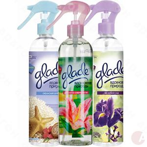 Освежитель воздуха "Glade". Распылитель - курок. Не содержит химических газов - пропеллентов и безвреден для большинства тканей. Объем - 400 мл. Аромат - ассорти.
