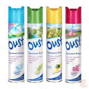 Освежитель воздуха OUST аэрозоль. Специальные активные вещества, входящие в формулу освежителя атакуют молекулы неприятного запаха и уничтожают их, оставляя после себя ощущение чистоты и свежести. Устраняет запахи туалета, мусорного ведра, табачного дыма и затхлости. Можно использовать в любых помещениях. Ассорти ароматов. Объем - 300 мл.