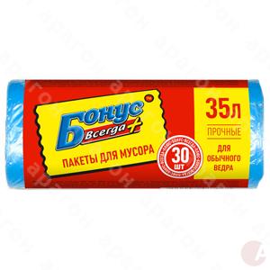 Пакеты для мусора "Бонус". Предназначены для удобства хранения и выноса мусора. Для стандартного мусорного ведра. Материал - полиэтилен HD. Размер - 50х60 см. Объем - 35 л. Цвет - синий. В упаковке 30 шт.
