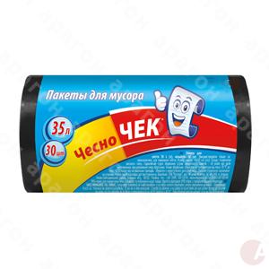 Пакеты для мусора "ЧесноЧек". Применяются со стандартными корзинами в офисах или рабочих помещениях. Производятся из плёнки равномерной толщины, что обеспечивает дополнительную надёжность. Объем - 35 л. В упаковке 30 шт.