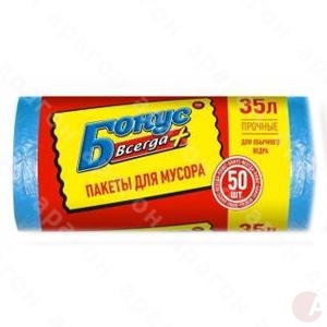 Пакеты для мусора "Бонус". Предназначены для удобства хранения и выноса мусора. Для стандартного мусорного ведра. Материал - полиэтилен HD. Размер - 45х55 см. Объем - 35 л. Цвет - синий. В упаковке 50 шт.