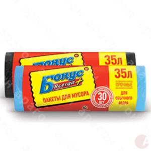 Пакеты для мусора "Бонус". Предназначены для удобства хранения и выноса мусора. Для стандартного мусорного ведра. Материал - полиэтилен HD. Размер - 45х55 см. Объем - 35 л. Цвет - синий, черный. В упаковке 30 шт.