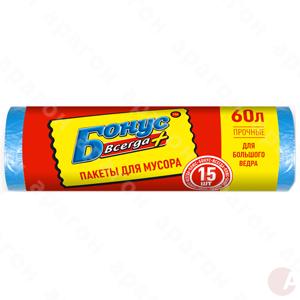 Пакеты для мусора "Бонус". Предназначены для удобства хранения и выноса мусора. Для большого мусорного ведра. Материал - полиэтилен HD. Размер - 60х80 см. Объем - 60 л. Цвет - синий. В упаковке 15 шт.