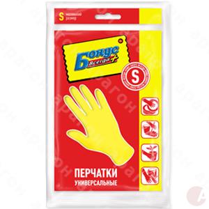 Перчатки универсальные "Бонус". Предназначены для мытья посуды, стирки белья, ухода за животными, чистки овощей. Материал - латекс, хлопковое напыление. Размер - S. Цвет - желтый. В полипропиленовой упаковке с подвесом.