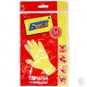 Перчатки универсальные "Бонус". Предназначены для мытья посуды, стирки белья, ухода за животными, чистки овощей. Материал - латекс, хлопковое напыление. Размер - M. Цвет - желтый. В полипропиленовой упаковке с подвесом.