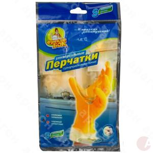 Перчатки универсальные "Фрекен Бок". Предназначены для мытья посуды, стирки белья, ухода за животными, чистки овощей. Материал - латекс, хлопковое напыление. Цвет - желтый. Размер - S. Полипропиленовая упаковка с подвесом.