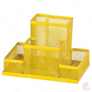 Подставка настольная металлическая. 4 отделения. Цельнометаллическое дно - не потеряются даже мелкие предметы, такие как скрепки или канцелярские кнопки. Размер - 150х100х100 мм. Вес - 0,2 кг. Цвет - желтый.