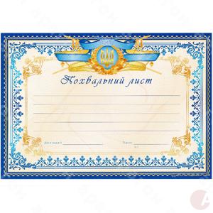 Похвальный лист. Полноцветная печать. Материал - картон. Формат - А4 (альбомная ориентация).