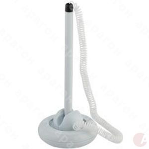 Ручка шариковая на подставке. Пластиковый ручка, подставка и пружина. Металлический наконечник. Подставка позволяет фиксировать ручку в вертикальном и горизонтальном положениях. Самоклеящееся основание подставки. Толщина линии письма - 0,7 мм. Цвет чернил - синий.