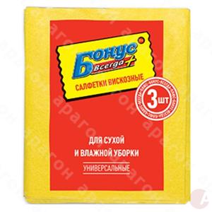 Салфетки вискозные "Бонус". Предназначены для всех видов влажной и сухой уборки. Размер - 30х38 см. Цвет - желтый. Материал - вискоза. В упаковке 3 шт.