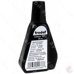 Краска штемпельная 7011 черная для заправки штемпельных подушек. Водная основа. Оттиск штампа можно наносить на все виды бумаги, кроме глянцевой. Используется со всеми типами резиновых и полимерных клише. В пластиковом флаконе с дозатором 28 мл.