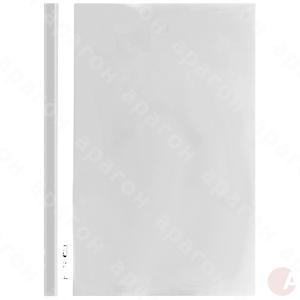 Папка-скоросшиватель без перфорации пластиковая. Формат – А4. Прозрачный верх. Толщина обложки – 120/160 мкм. Фактура – глянец. Цвет – белый.