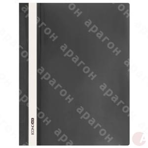 Папка-скоросшиватель без перфорации пластиковая. Формат – А4. Прозрачный верх. Толщина обложки – 120/160 мкм. Фактура – глянец. Цвет – черный.