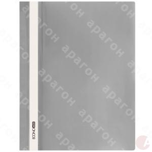 Папка-скоросшиватель без перфорации пластиковая. Формат – А4. Прозрачный верх. Толщина обложки – 120/160 мкм. Фактура – глянец. Цвет – серый.