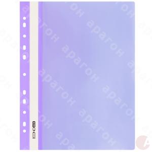 Папка-скоросшиватель с перфорацией пластиковая. Формат – А4. Прозрачный верх.Толщина обложки – 120/160 мкм. Фактура – глянец. Цвет – фиолетовый.