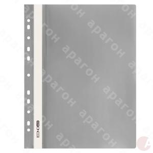Папка-скоросшиватель с перфорацией пластиковая. Формат – А4. Прозрачный верх.Толщина обложки – 120/160 мкм. Фактура – глянец. Цвет – серый.