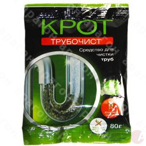 Средство для чистки сливных труб «КРОТ трубочист» 80 г. Предназначен для эффективной очистки всех видов засоренных сливных труб, сифонов, кухонных моек, раковин, ванн от жировых и других рганических отложений. Убивает микробы, устраняет неприятный запах.