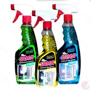 Средство для стекол и блестящих поверхностей "Sama". Легко и быстро удаляет грязь, жир, сажу и другие загрязнения с поверхностей оконного, витринного, автомобильного стекла, зеркал, кафеля, внешних поверхностей электробытовых приборов, хромированных и никелированных блестящих поверхностей. Пластиковый флакон с распылителем-триггером. Объем - 500мл.