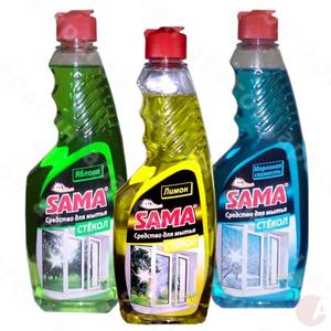 Средство для стекол и блестящих поверхностей "Sama". Легко и быстро удаляет грязь, жир, сажу и другие загрязнения с поверхностей оконного, витринного, автомобильного стекла, зеркал, кафеля, внешних поверхностей электробытовых приборов, хромированных и никелированных блестящих поверхностей. Пластиковый флакон-запаска. Объем - 500мл.