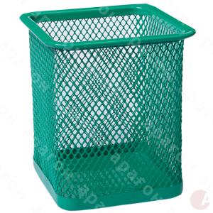 Подставка для ручек квадратная. Изготовлена из металлической сетки. Сглаженные швы на изделиях для безопасности при использовании. Цельнометаллическое дно. Размер - 80х80х95 мм. Цвет - зеленый.