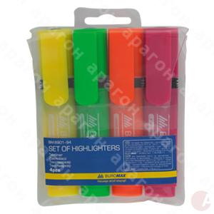 Набор флеоресцентных цветных тексмаркеров. В наборе 4 цвета: желтый, оранжевый, зеленый, розовый. На водной основе. Толщина линии письма - 2-4 мм. Упаковка с подвесом.