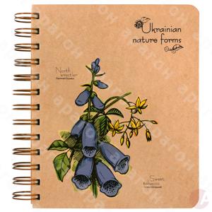 Блокнот "Квіти України" (борец северный, табак душистый) на 100 листов. Материал обложки - крафт. Крепление бумажного блока - боковая евроспираль, бронза. Размер - 140х172 мм.