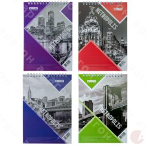 Блокнот "Metropolis" на 48 листов (клетка). Крепление бумажного блока - верхняя спираль. Картонная обложка. Формат - А4. Цвет - ассорти.