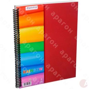 Тетрадь рабочая «Rainbow» на 80 листов (клетка). Обложка – пластик, вставка – плотный картон с печатью. Крепление блока – боковая спираль. Плотность офсетной бумаги – 70 г/м2. Формат – А4. Цвет обложки – ассорти (красный, зеленый, желтый, серый).
