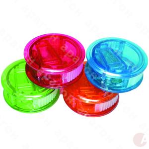 Точилка на одно лезвие. Пластиковый полупрозрачный корпус с контейнером. Механизм закрывания отверстия. Цвет - ассорти.